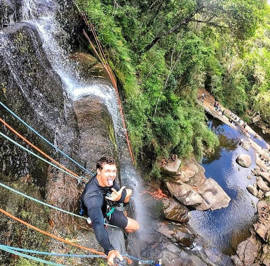 O rapel possui 35 metros e conta com parte positivas (com apoio dos pés) e partes negativas (pendurado totalmente nas cordas). E o que torna essa aventura ainda mais perfeita é a queda d'água no momento do rapel.